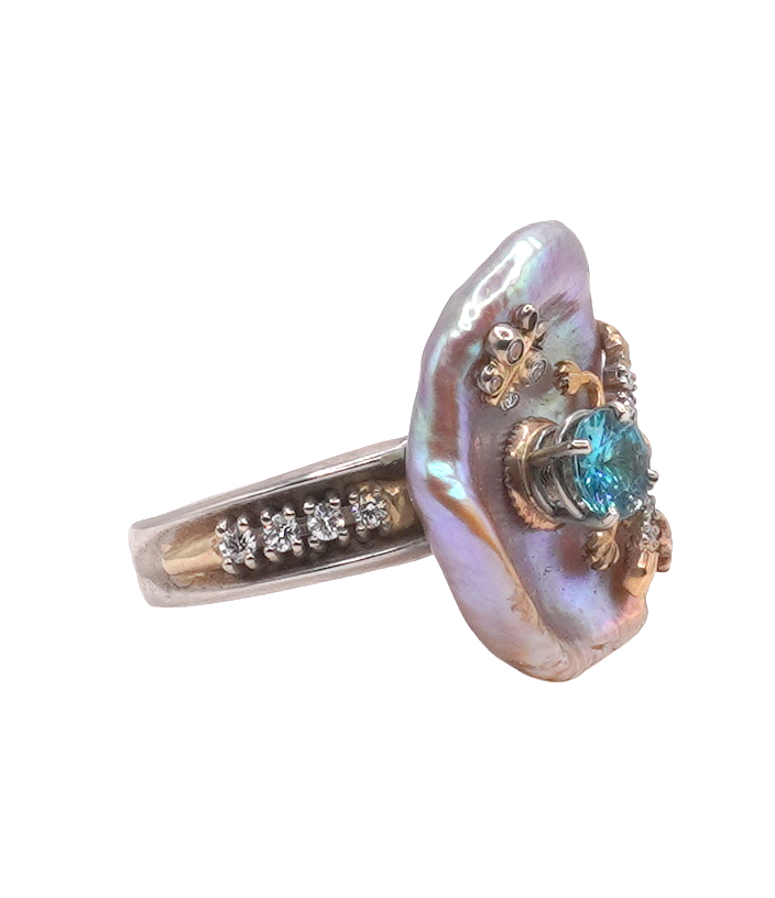 Pearl Cup Lizard Butterfly and Lab Diamond Ring- 14k Two Tone Lumina Gem Wilmington, NC